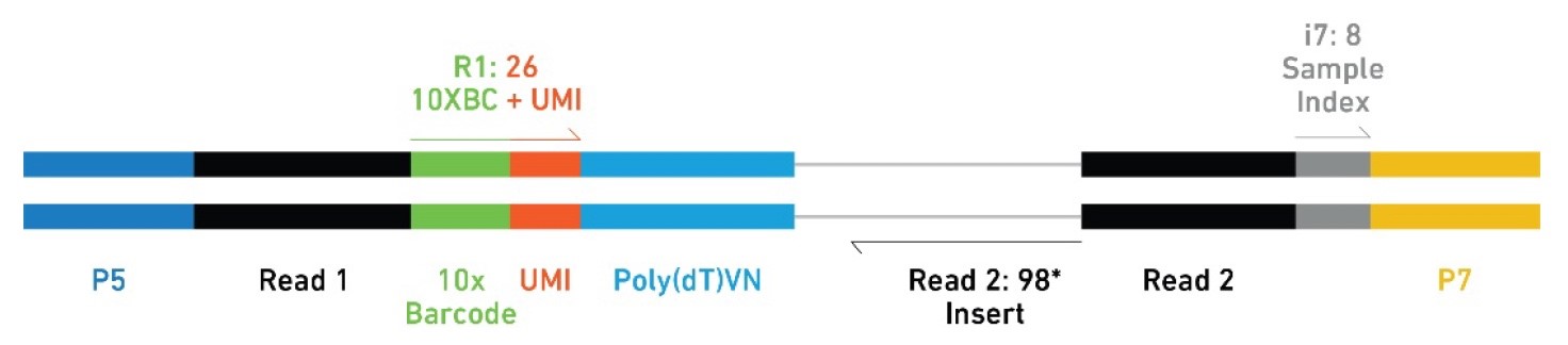 The Single Cell V(D)J Solutions produce V(D)J enriched and 5' gene expression Illumina-ready sequencing libraries. A library comprises standard Illumina paired-end constructs which begin and end with P5 and P7. For V(D)J enriched libraries, Read-1 encodes the 16 bp 10x Barcode, 10 bp UMI, and 13 bp Switch Oligo, as well as the 5' end of an enriched transcript. For 5' gene expression libraries, Read-1 encodes the 16 bp 10x Barcode and 10 bp UMI. Due to Enzymatic Fragmentation, for both libraries Read-2 encodes a random internal fragment of the corresponding insert. Sample index sequences are incorporated as the i7 index read. See picture below: